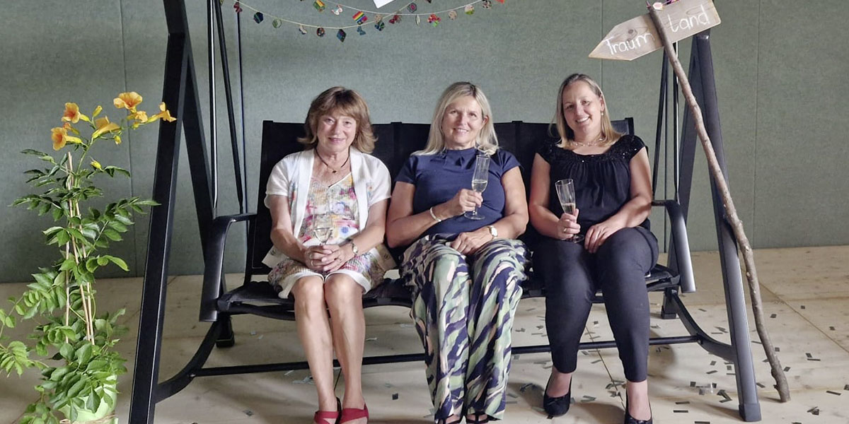 „Wir wollten dir mal eben sagen, dass du das Größte für uns bist!“ und „Atemlos durch neun Jahr – unsere Führung wunderbar“ waren nur zwei der Lieder, die zum Abschied vorgetragen wurden. Mit einem großartigen Fest wurde unsere langjährige Rektorin Frau Ruth Wagner von der Schulfamilie in den Ruhestand verabschiedet. Ein erster, lang ersehnter Wusch konnte schon mal erfüllt werden: eine Hollywoodschaukel. Zum Probesitzen nahmen ihre Vorgängerin, Frau Marion Schweiger (l.), und ihre Nachfolgerin, Frau Alexandra Hufsky (r.), neben ihr Platz. Wir wünschen ihr von Herzen alles Gute für den neuen Lebensabschnitt.