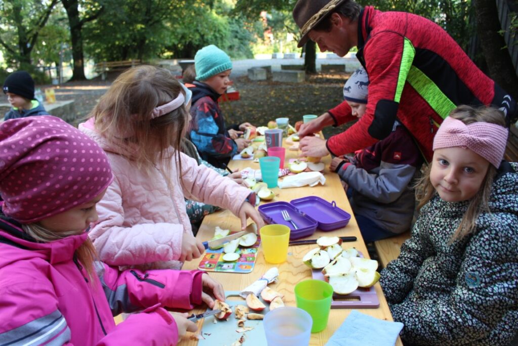 Zu Besuch war Andreas Brummer aus Echsheim, ein erfahrener Streuobstwiesenführer. Er brachte nicht nur viele spannende Informationen rund um den Apfel mit, sondern auch seine Begeisterung für die Natur. Gemeinsam mit ihm lernten die Kinder, wie aus Äpfeln Saft entsteht – von der Ernte über das Waschen und Zerkleinern bis hin zum Pressen.
