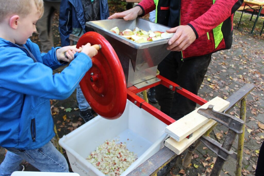Natürlich durfte jeder mithelfen: Die Kinder waren mit vollem Einsatz dabei, schleppten Eimer, drehten an der Presse und staunten, wie der goldgelbe Saft aus den Äpfeln floss.