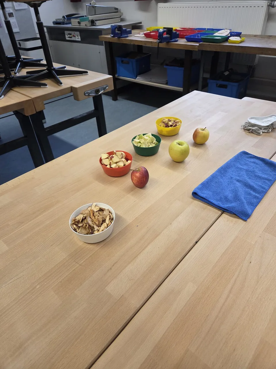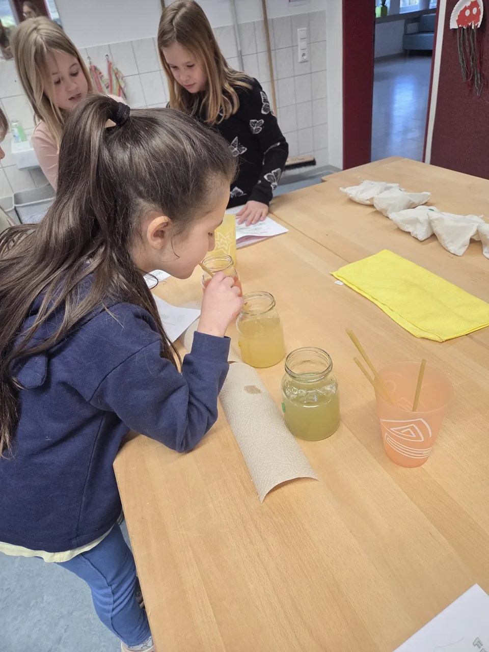 Besonders knifflig wurde es bei einem kleinen Experiment: Mehrere Becher mit verschiedenfarbigen Säften standen bereit. Die Kinder überlegten eifrig: Ist das Orangensaft? Pfirsich? Vielleicht Multivitamin? Die Ideen waren kreativ und vielfältig. Die Überraschung am Ende war groß – denn tatsächlich handelte es sich bei allen Säften um denselben Apfelsaft!