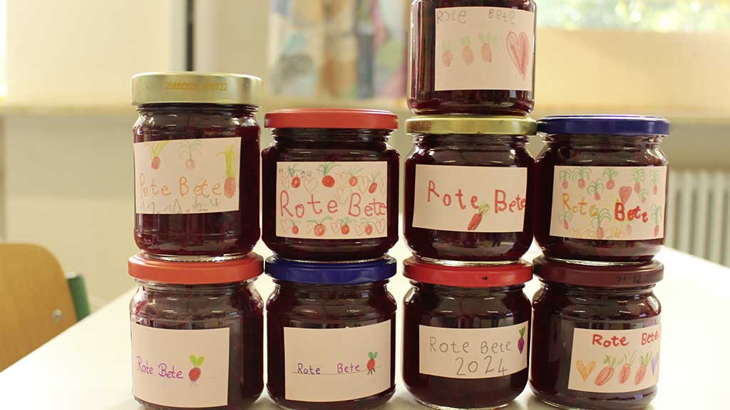 Im Rahmen der Garten-AG lernen die Kinder im Laufe eines Schuljahres Selbstversorgungsmöglichkeiten in unserem Schulgarten kennen. Es soll ihnen somit das Leben mit der Natur und den entsprechenden Jahreszeiten bewusst werden. Im Frühjahr haben die Kinder der letztjährigen Garten-AG Rote Bete als winzig kleine Samenkörner ausgesät. Jetzt im Oktober konnten wir nun das reife Gemüse, das die ganzen letzten Monate gegossen und gepflegt wurde, als große Knollen ernten. Wir verarbeiteten die Rote Bete, indem wir sie mit Gewürzen in Gläser einweckten. Die Kinder freuten sich darauf, ein Glas mit nach Hause nehmen zu dürfen und einmal zu probieren.