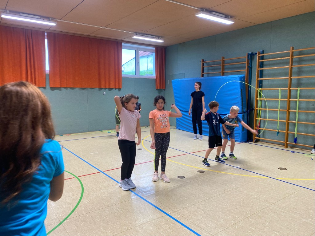 Am Montag, den 06.10.2025 durften die Schüler und Schülerinnen der Klasse 3b am „Skipping Hearts“-Workshop teilnehmen. Zusammen mit der Trainerin erlernten sie bei guter Musik die Basics am Seil. Für die Eltern studierten die Kinder eine Choreografie ein, die sie am Ende des Workshops voller Stolz vor Publikum präsentieren durften. Das war ein anstrengendes, aber wundervolles Projekt!