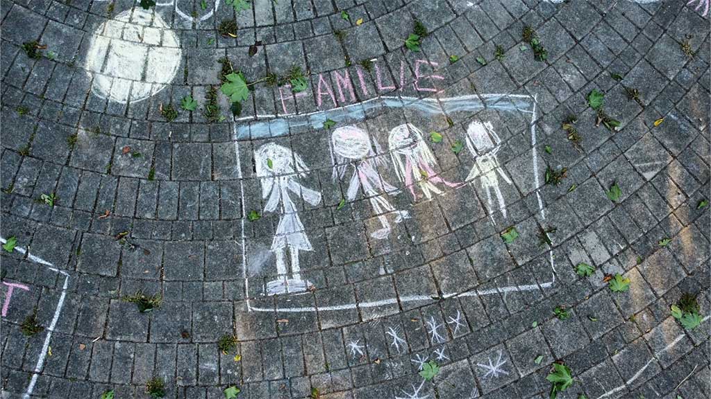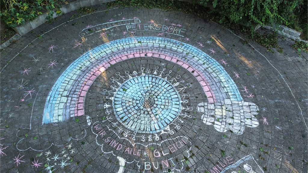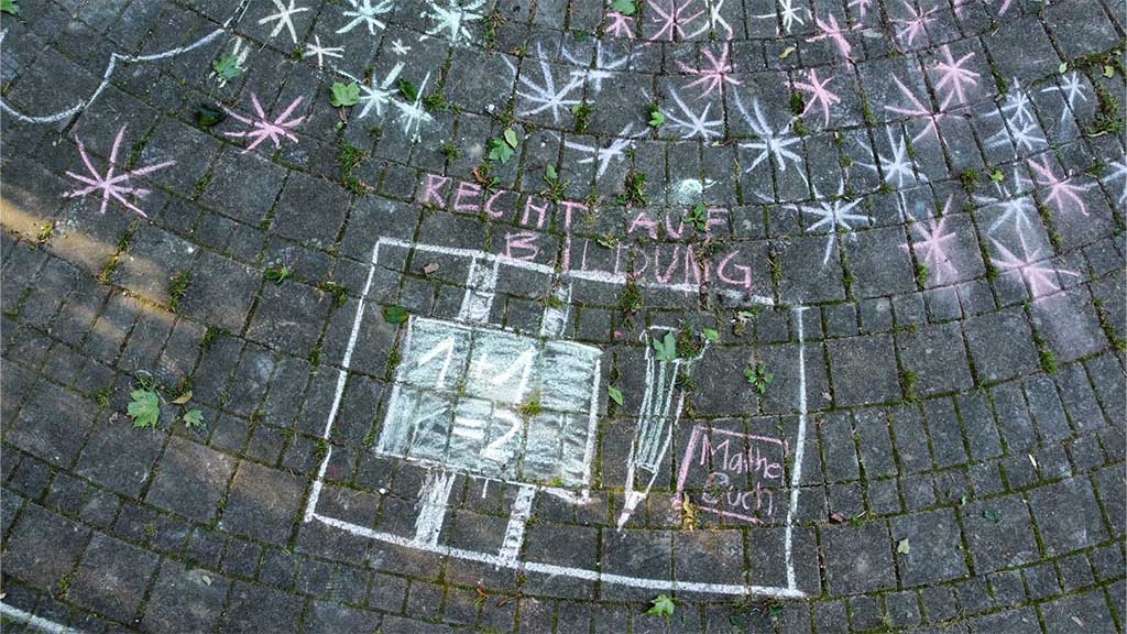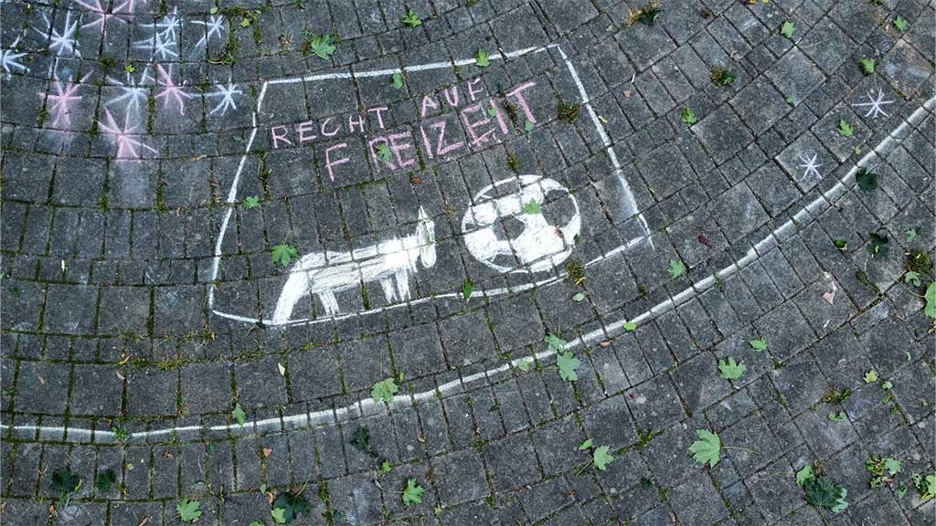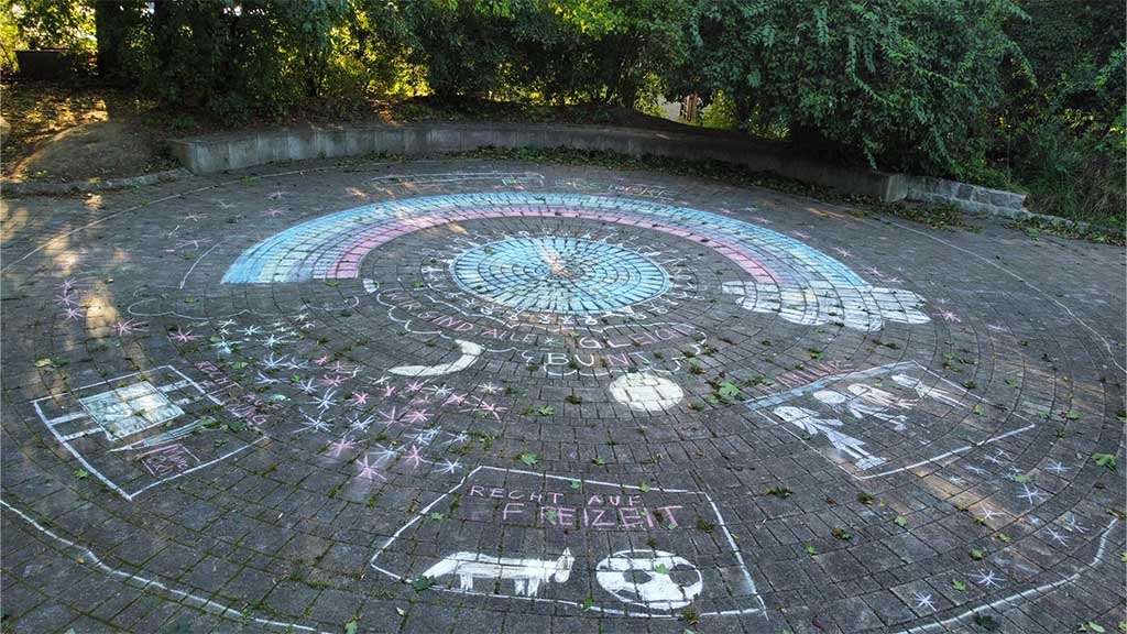 Zum Weltkindertag haben die Schülerinnen und Schüler der Ethikgruppe mit Kreide im Pausenhof gemalt. Im Rahmen der Verfassungsviertelstunde standen dabei die Kinderrechte im Mittelpunkt.